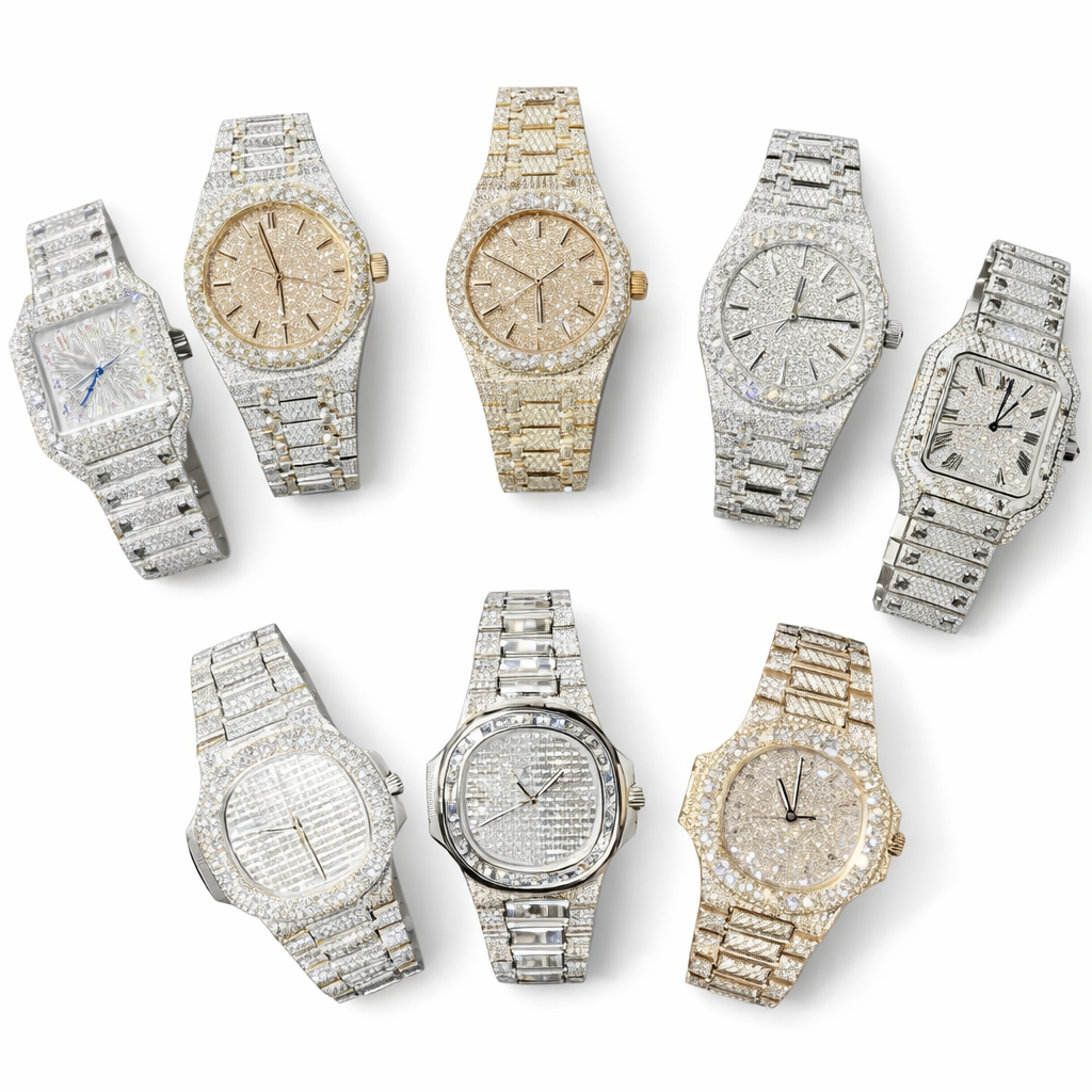 More than timepieces—these are statements. Every watch in our collection is meticulously crafted to blend precision with presence: bold octagonal bezels, flawless pavé diamond settings, and designs that balance modern edge with timeless elegance. From full diamond brilliance to two-tone accents and sleek straps, each piece is built to catch the light—and the attention of anyone in the room. This is more than keeping time. This is owning it.