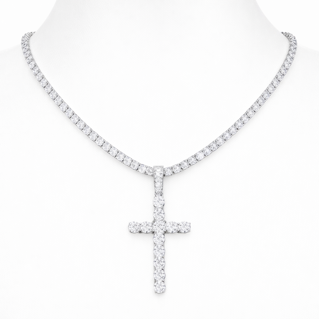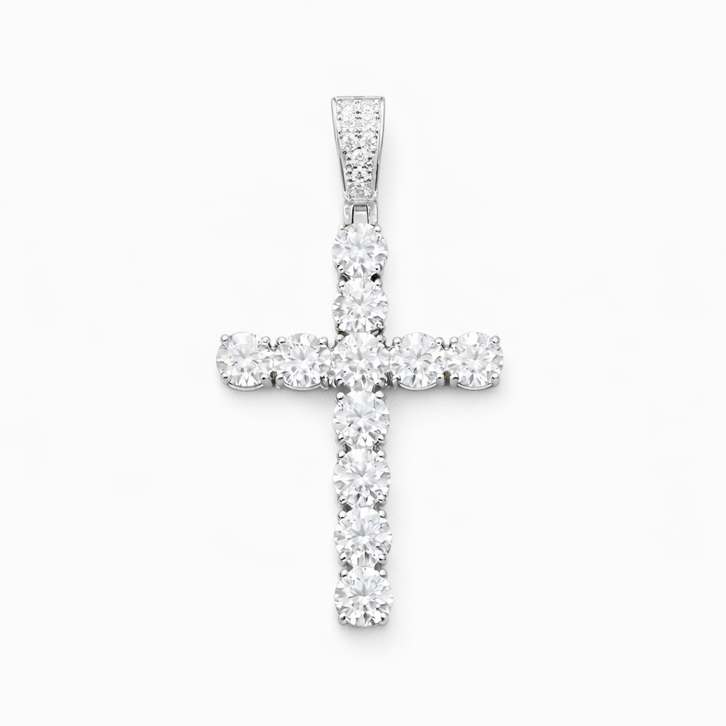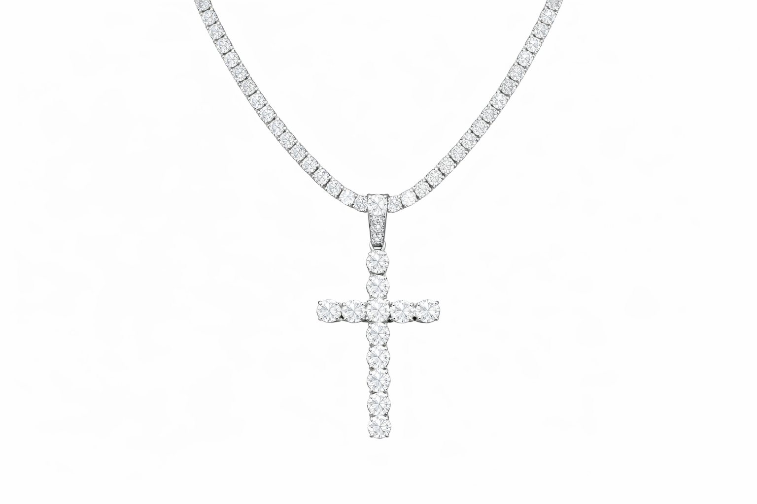 Radiating pure brilliance and timeless sophistication, the Circular Tennis Cross is a refined expression of faith elevated by elite craftsmanship. Featuring flawlessly set round stones in a continuous tennis-style formation, this piece delivers a clean, uninterrupted shine that captures light with every movement. Its balanced silhouette and precision detailing create a powerful yet elegant presence. More than a pendant, the Circular Tennis Cross stands as a symbol of clarity, strength, and uncompromising luxury.