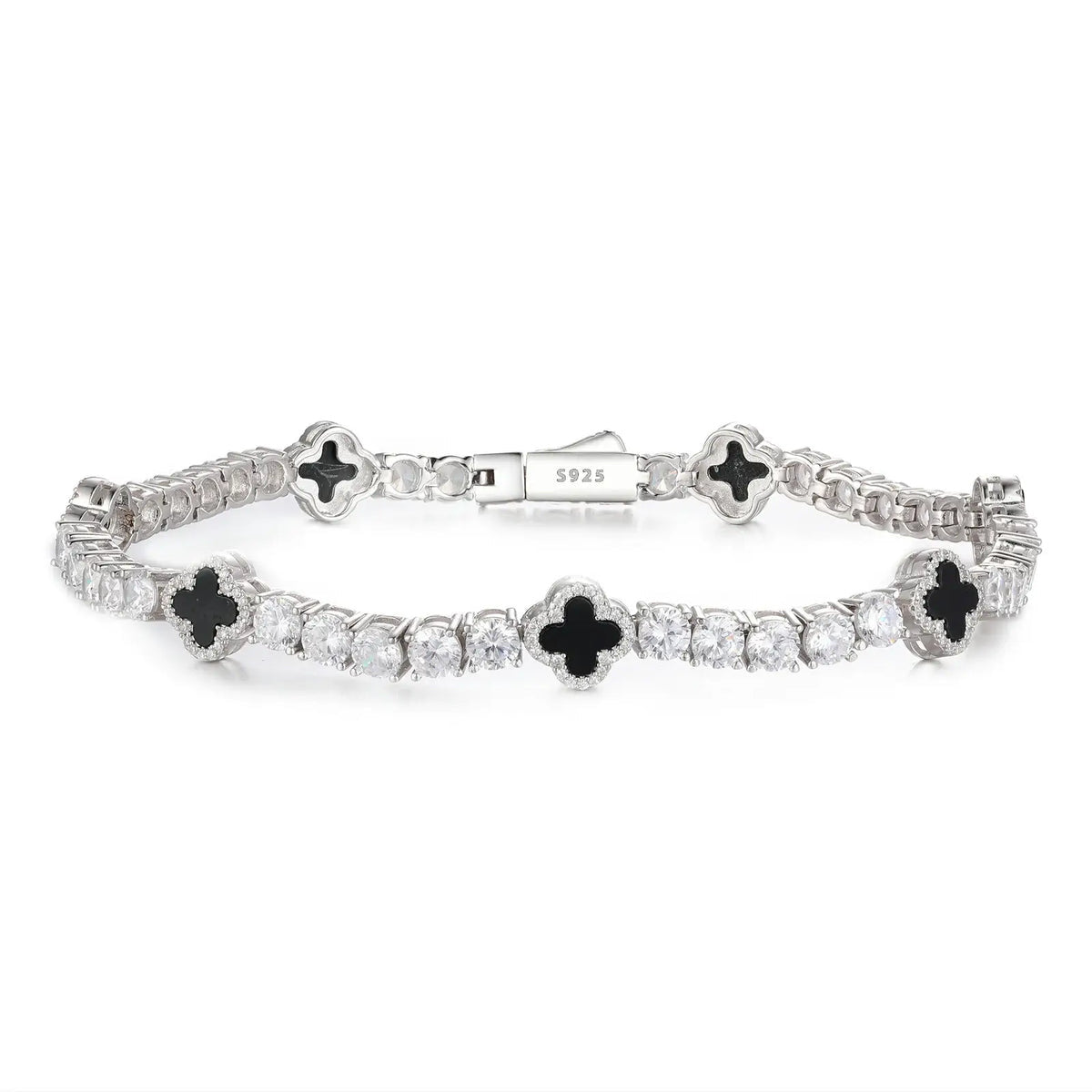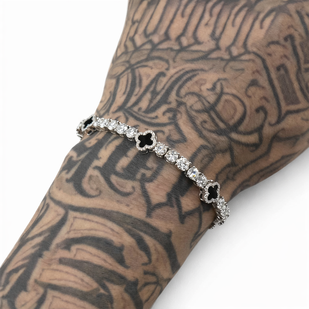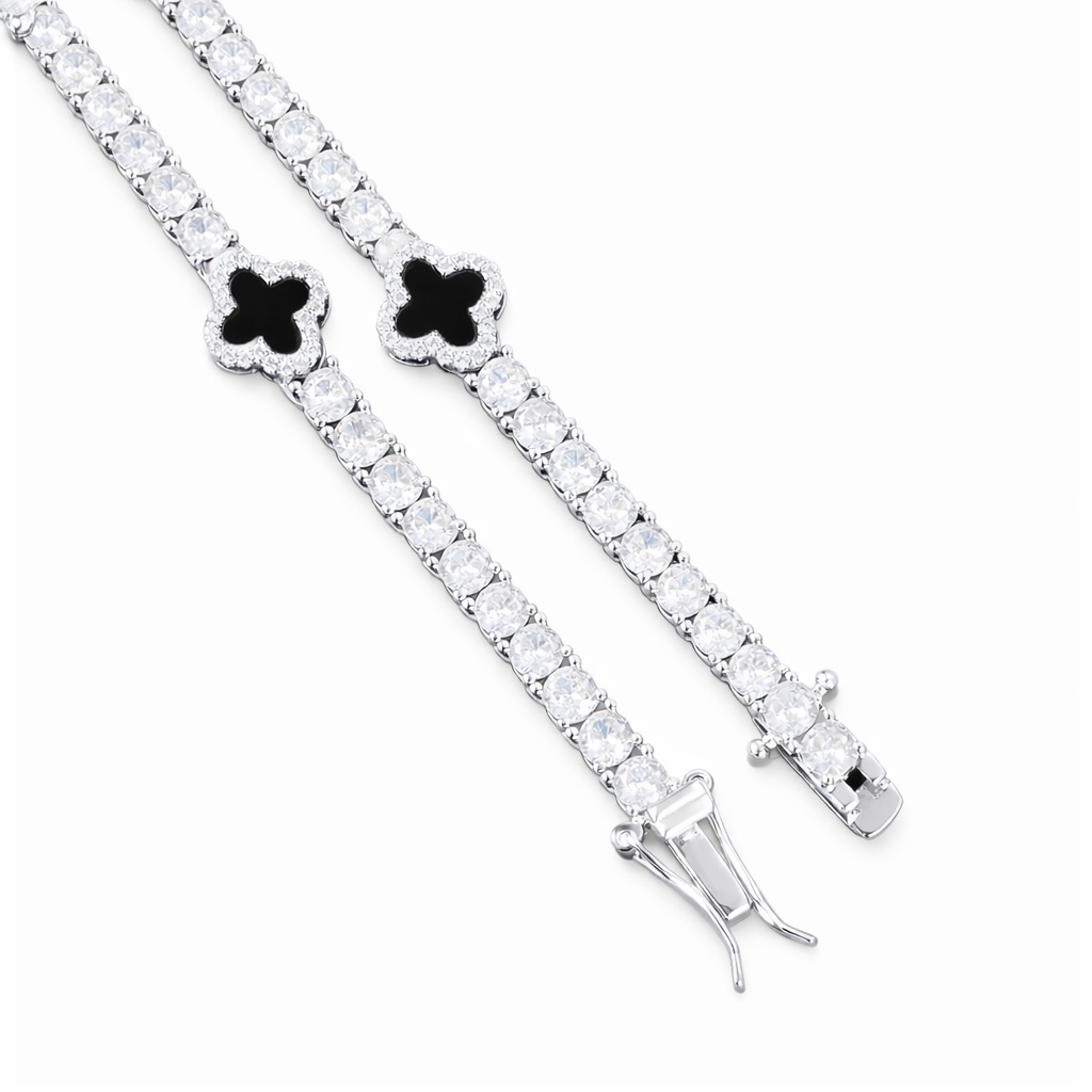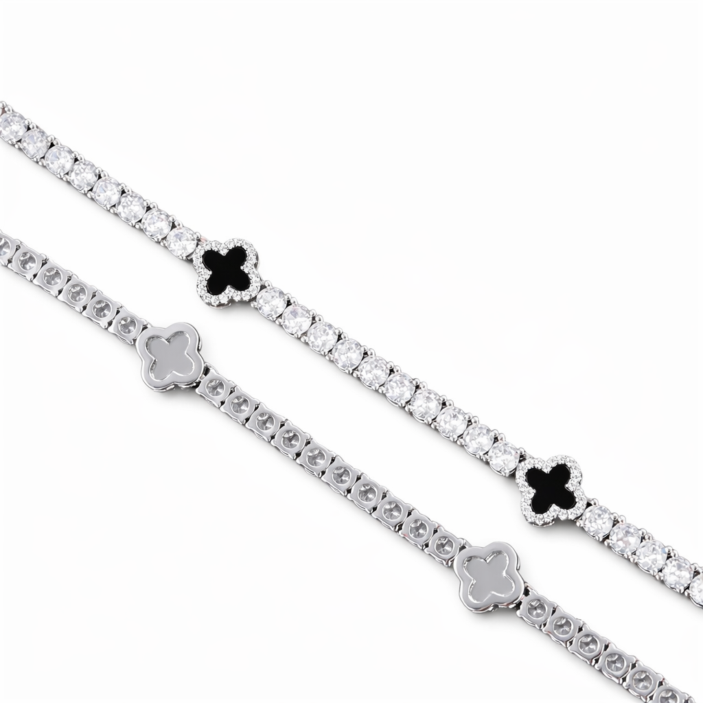 Radiating refined elegance and symbolic power, the Four Leaf Clover Bracelet is a statement of fortune elevated by luxury craftsmanship. Featuring sleek clover motifs set between brilliant round stones, this design delivers a balanced contrast of bold detail and radiant sparkle. Its seamless flow and polished white gold finish create a sophisticated presence on the wrist. More than a bracelet, the Four Leaf Clover stands as a symbol of luck, confidence, and timeless prestige.