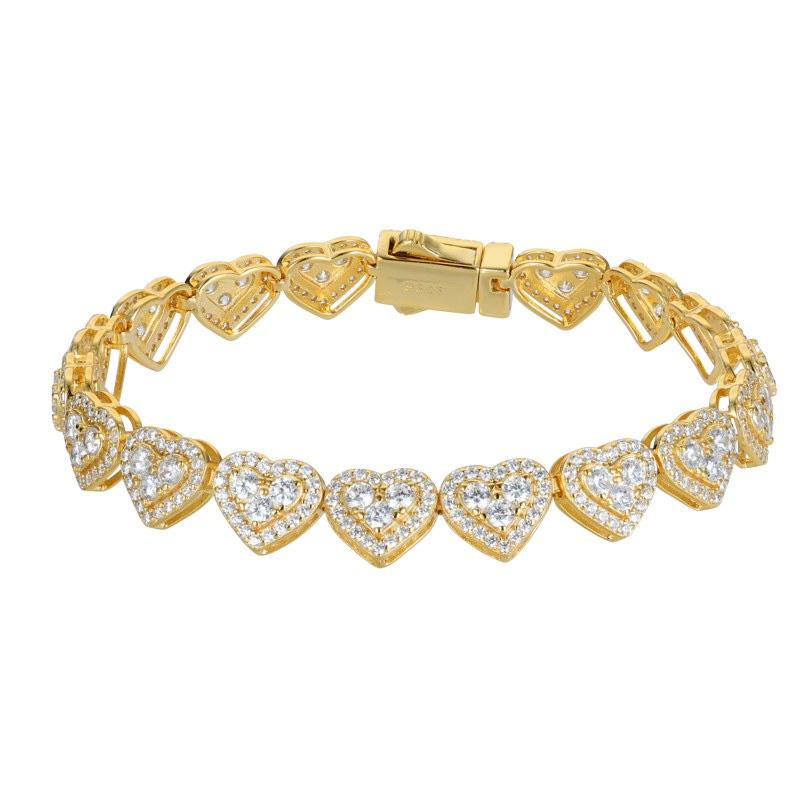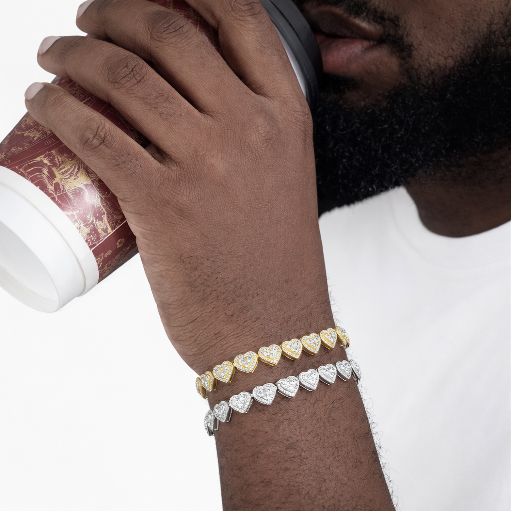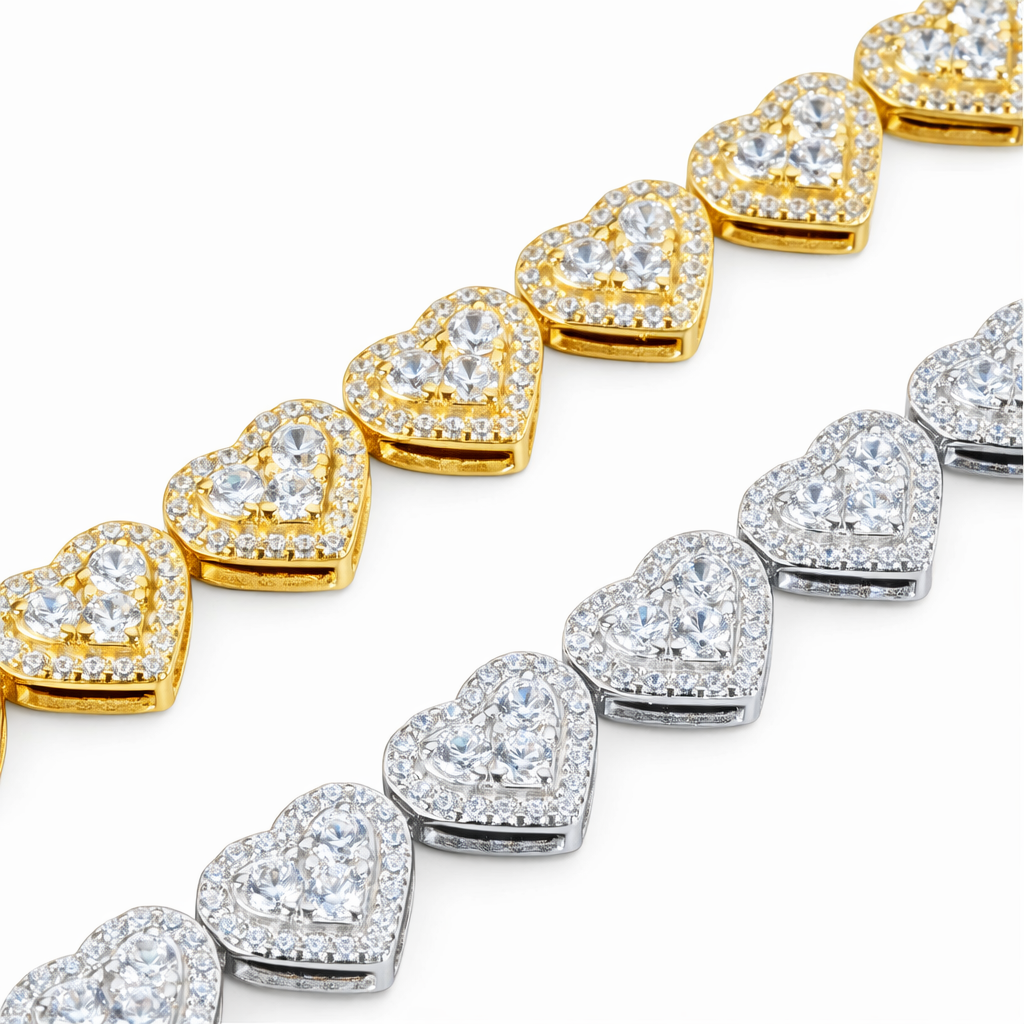 Radiating bold romance and elevated brilliance, the Heart Stone Bracelet is a striking expression of love fused with uncompromising luxury. Featuring intricately crafted heart-shaped links, each fully encrusted with precision-set stones, this design delivers a continuous, radiant shine that wraps the wrist with elegance and authority. Its flawless symmetry and refined craftsmanship create a powerful yet timeless presence. Available in white gold and yellow gold finishes, this piece stands as a symbol of passion, confidence, and elite prestige.
