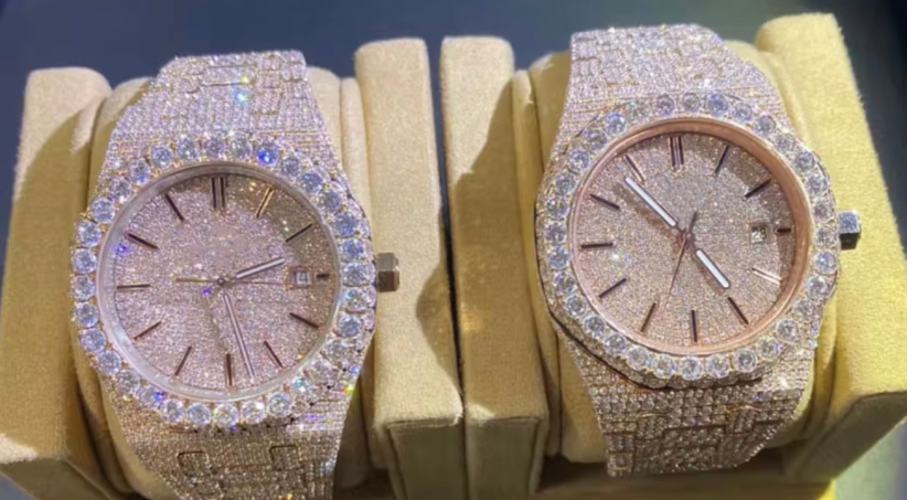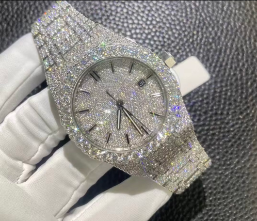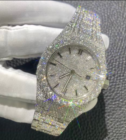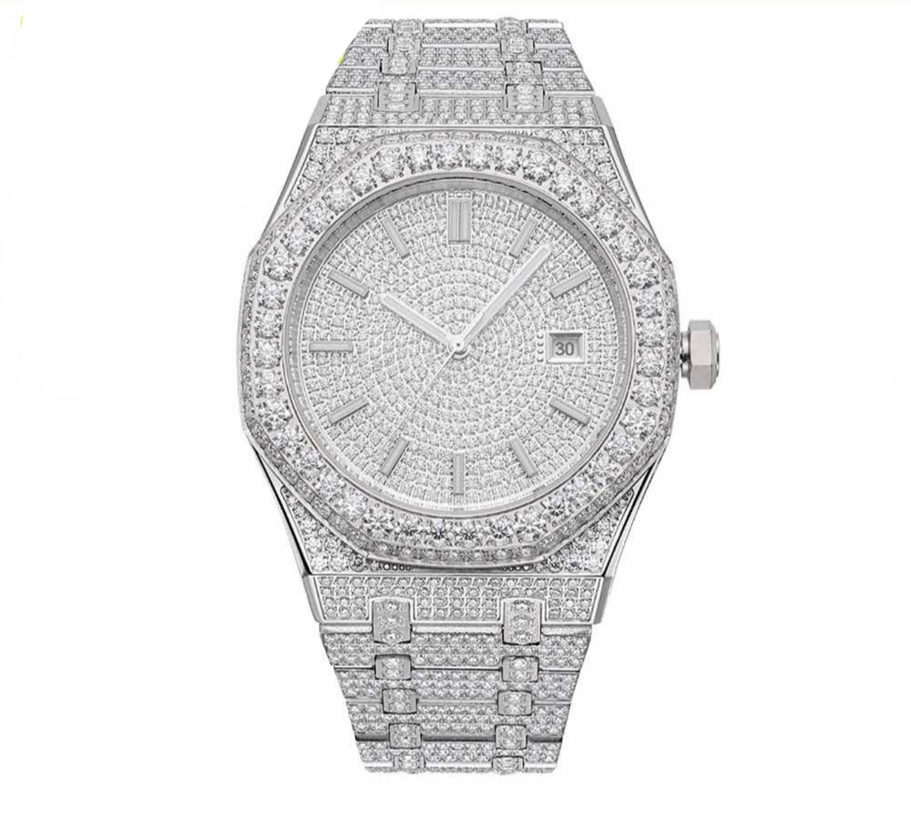 Drenched in brilliance, this fully iced-out timepiece radiates luxury from every angle. Every inch of the case, dial, and bracelet is encrusted with precision-set stones, creating an unstoppable shine. More than just a watch, it’s a bold statement of wealth, power, and unmatched style — crafted for those who demand the spotlight.