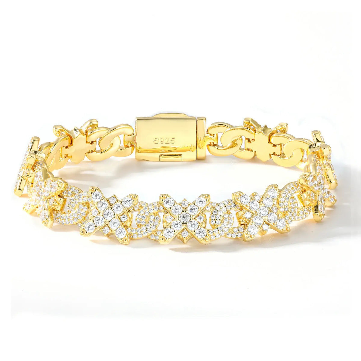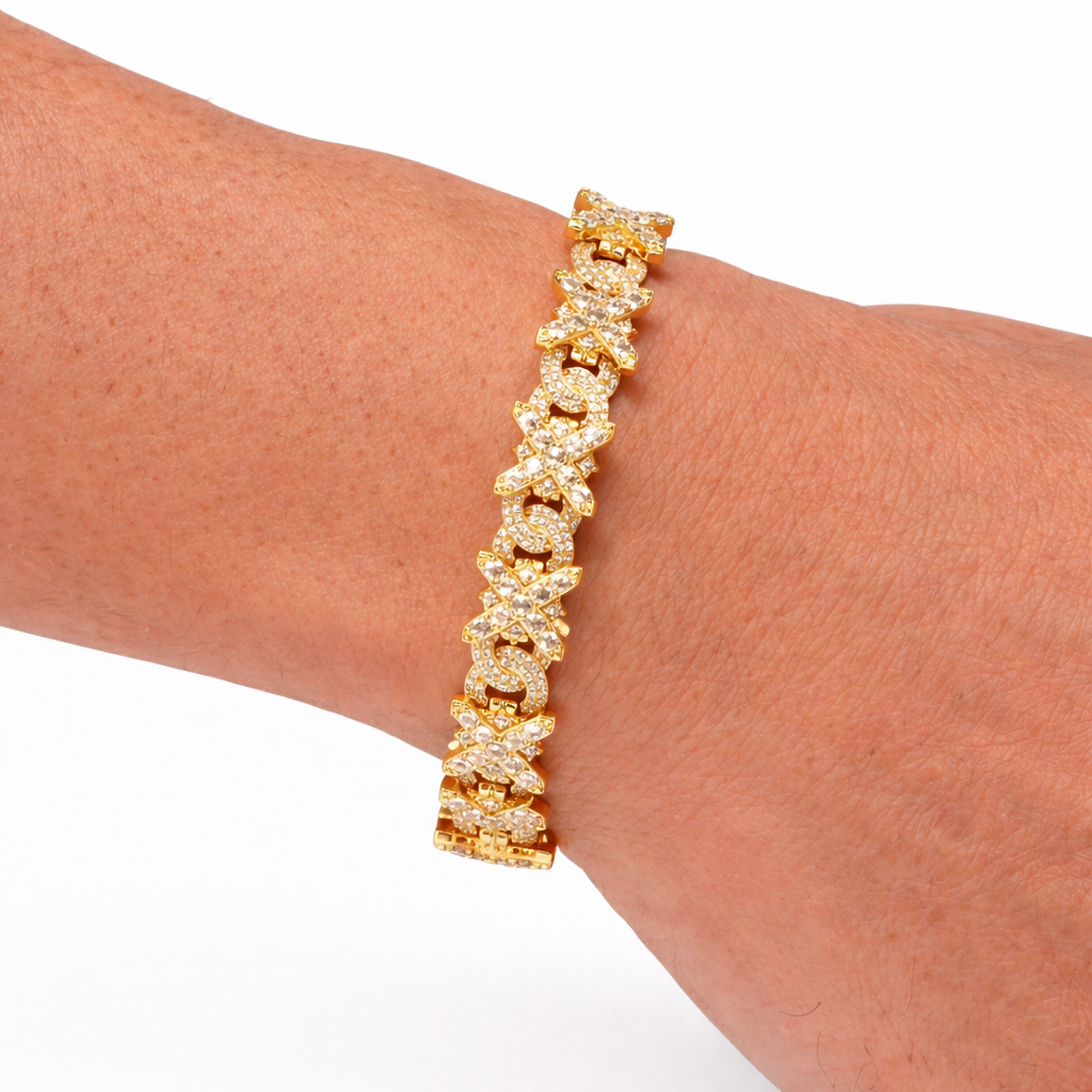 Radiating limitless power and elevated craftsmanship, the Infinity X Link Bracelet is a bold fusion of strength and luxury. Featuring intricately connected X-shaped links, each precision-set with brilliant stones, this design delivers a dynamic sparkle with a commanding presence. Its seamless flow and substantial build reflect confidence and control, while the polished finish enhances its brilliance. Available in white gold and yellow gold, this piece goes beyond adornment—it stands as a symbol of unity, dominance, and timeless prestige.