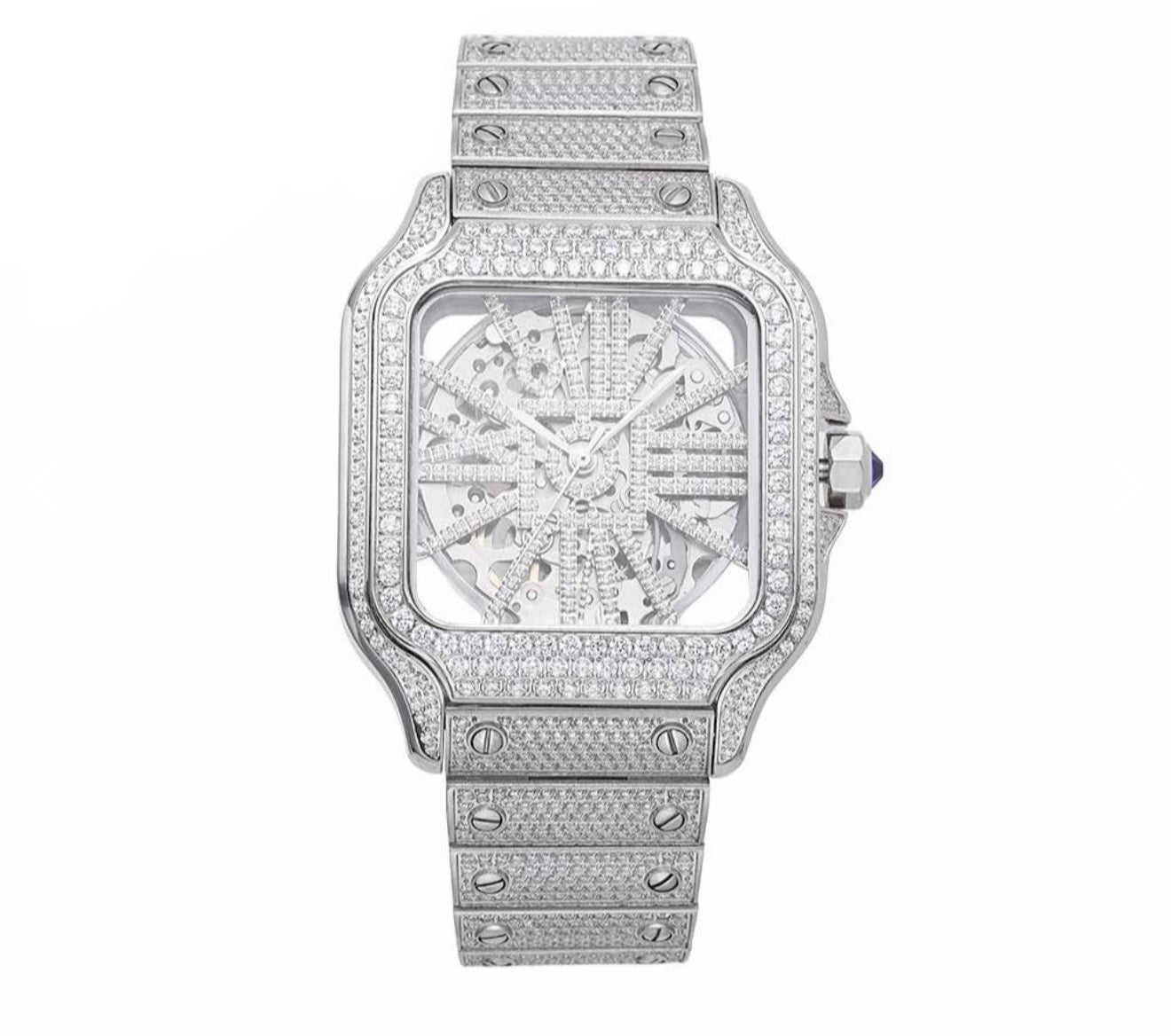 Bold and refined, this fully iced-out timepiece transforms classic design into a spectacle of brilliance. Its square case and skeleton-style dial shine with meticulously set stones, while the bracelet glimmers with flawless detail. A true symbol of prestige and individuality, it’s built for those who embrace power, success, and unapologetic style.