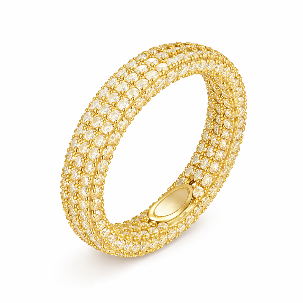 Radiating endless brilliance and elevated refinement, the Prong Infinity Ring is a bold expression of continuity, strength, and luxury. Featuring precision-set stones secured in a seamless prong setting, this design delivers a fluid, uninterrupted shine that wraps the finger in commanding elegance. Its rounded profile enhances both comfort and presence, making it a timeless statement piece. Available in white gold and yellow gold finishes, the Prong Infinity Ring stands as a symbol of eternity, success, and unmistakable prestige.