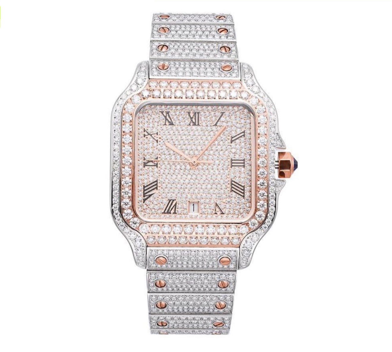 A striking fusion of luxury and craftsmanship, this fully iced-out timepiece commands attention with its square case and two-tone detailing. The dial, case, and bracelet are drenched in precision-set stones, radiating brilliance from every angle. Bold yet refined, it’s more than a watch — it’s a statement of success, prestige, and unstoppable style.